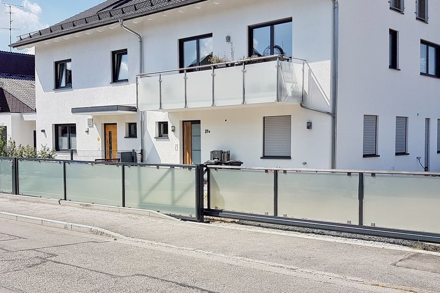 Balkongelaender pulverbeschichtet mit Stabfuellung und VSG Glas Mattfolie